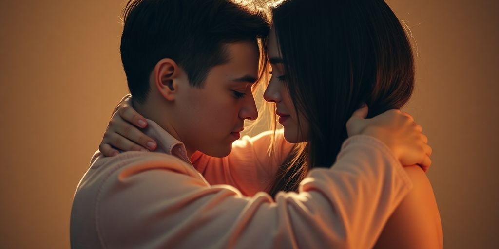 Two people connecting with warm, soft light.